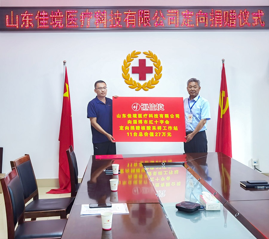 6月27日下午,山東佳境醫療科技有限公司向淄博市紅十字會捐贈用于抗擊新冠病毒的核酸采樣工作站11臺,總價值27萬元,支援我市疫情的防控工作。淄博市紅十字會二級調研員劉永鋒、佳境醫療董事長鐘文泉先生出席捐贈活動。劉永鋒表示:“非常感謝佳境醫療的無私捐贈,這是一次積極向上、回報社會的愛心行動,對廣大企業積極參與抗擊疫情、履行社會責任將起到示范作用。鐘文泉表示:“臨近七一建黨節,作為一名黨員,一定要響應黨和政府的號召,盡自己的綿薄之力,向所有抗疫一線的醫護人員表示敬意”。